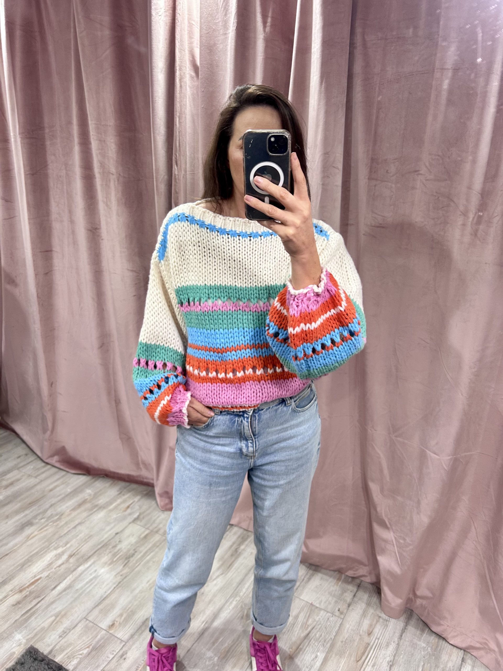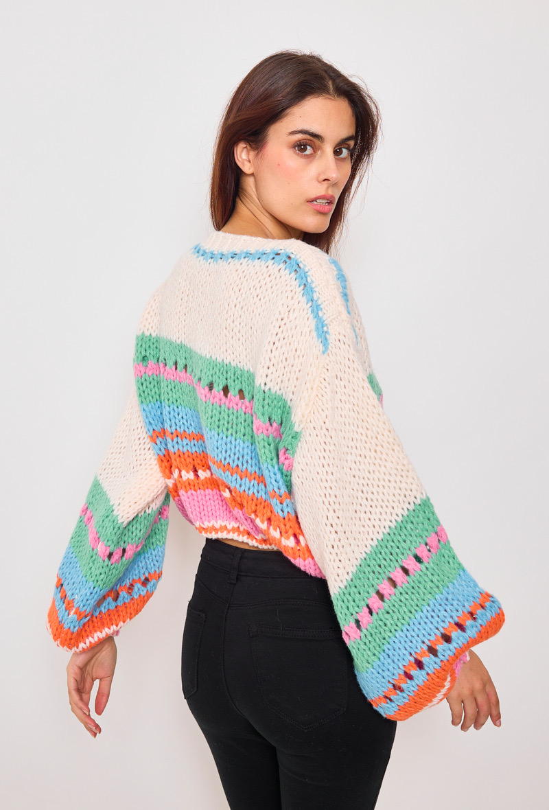 This dreamy knitted jumper features bold pastel stripes in sunset shades, with cozy long sleeves for that laid-back yet stylish look